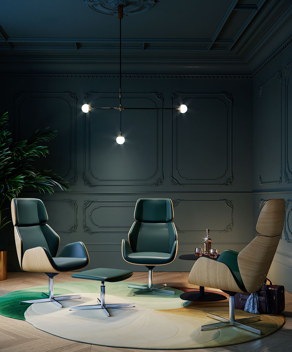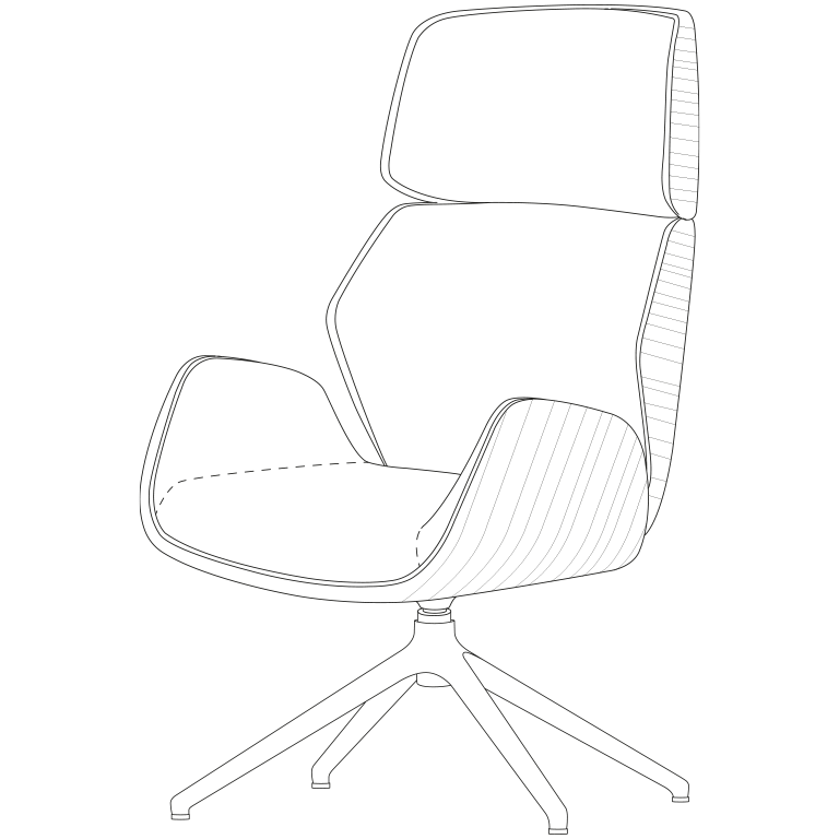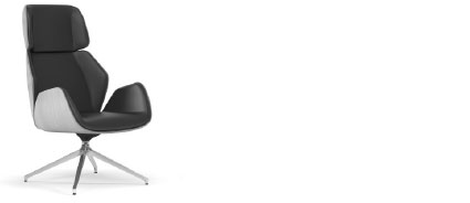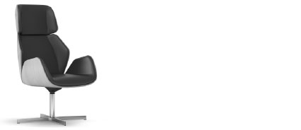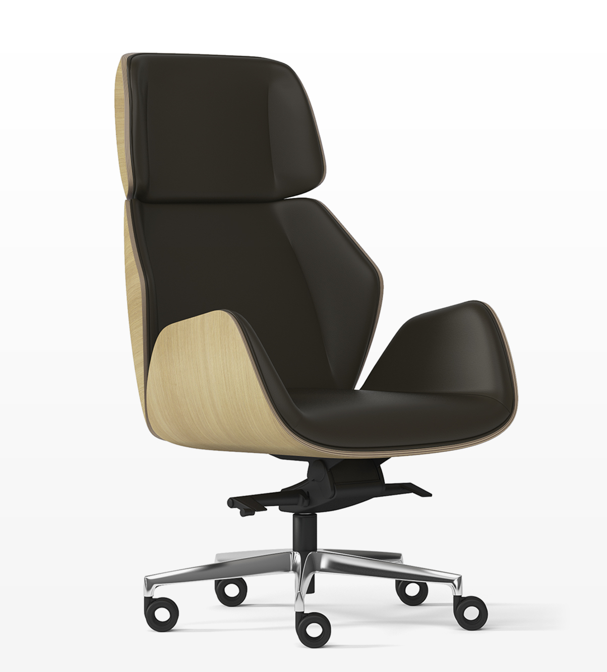 High back armchair,natural polished oak wood shell, free floating tilt mechanism, 4-legged pyramid aluminum base ø 840