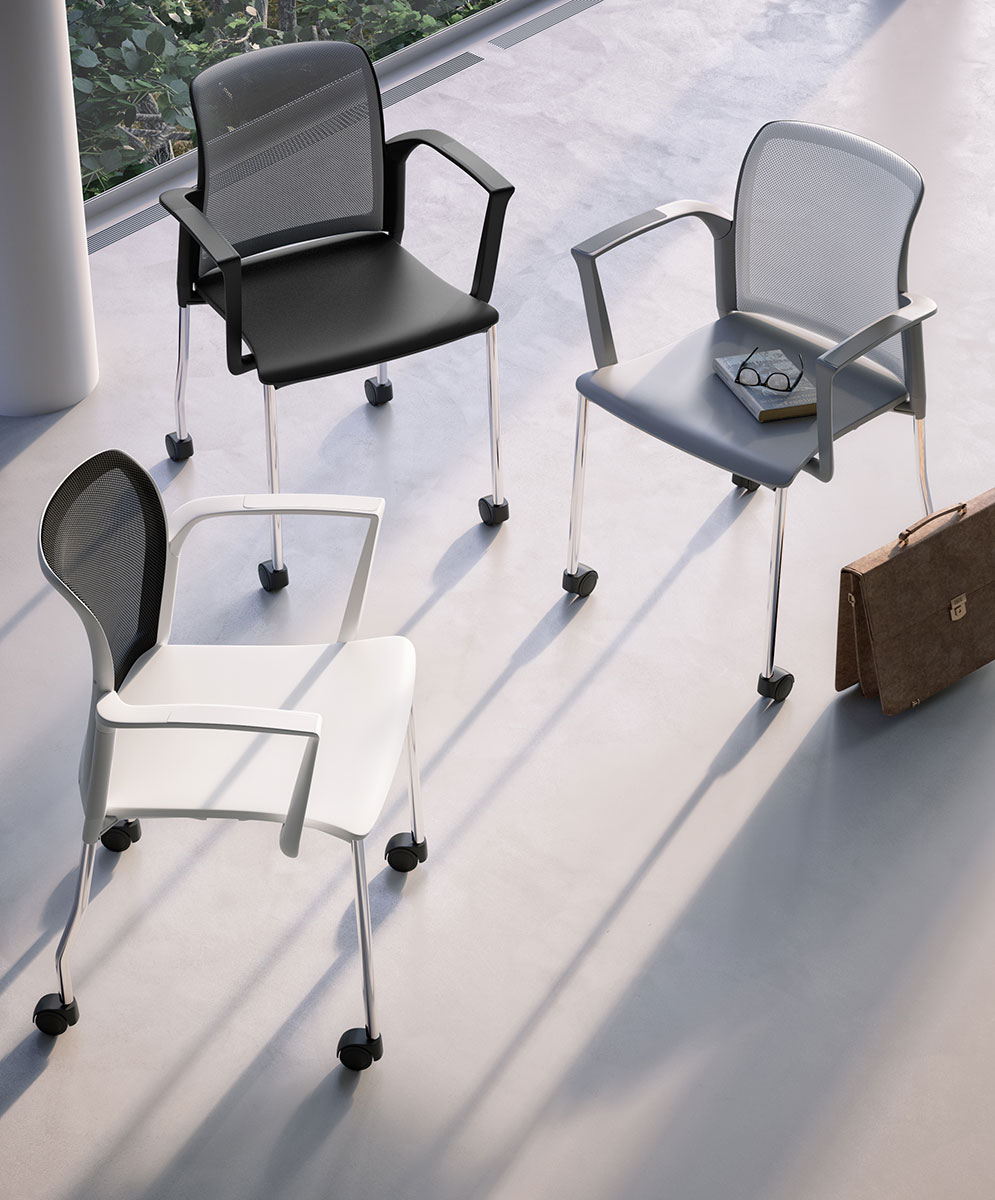 Sedia impilabile con braccioli, sedile in polipropilene, schienale in rete, su telaio a 4 gambe cromo con ruote