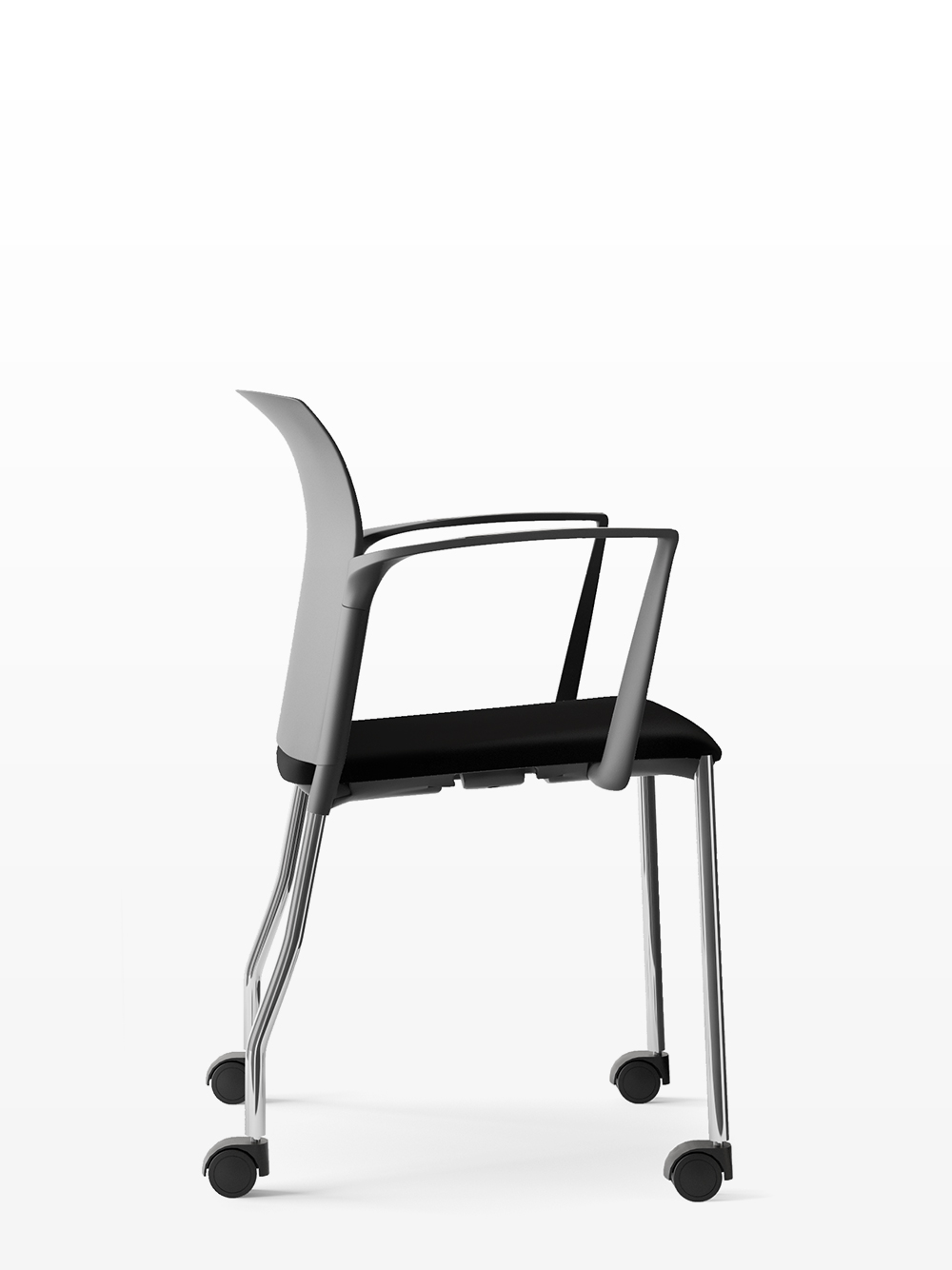 Sedia impilabile con braccioli, sedile imbottito, schienale rete, su telaio a 4 gambe cromo con ruote